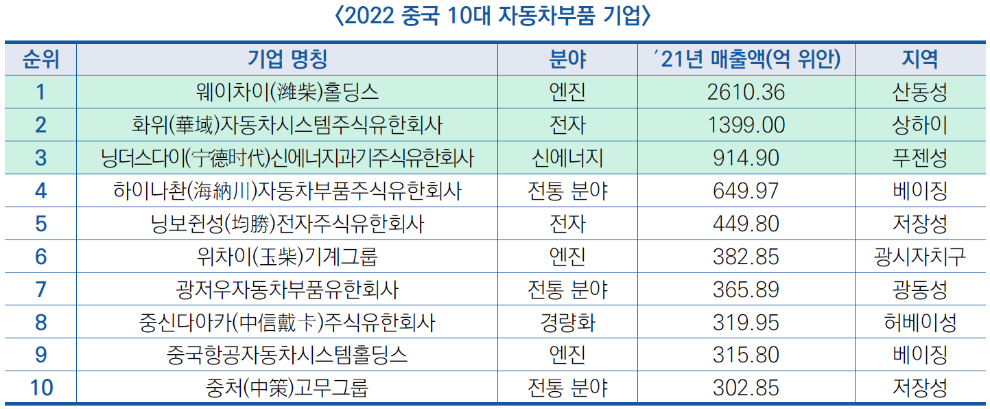 - 위이차이(潍柴)홀딩스는 중국 내 1위와 글로벌 4위를 확보하고, 화위(华域)자동차를 포함하여전체 14개 기업이 글로벌 자동차부품 100대 기업에 선정
