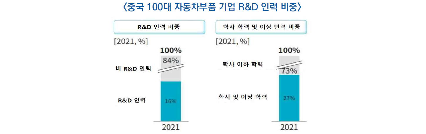 ![]() ○ ′21년 중국 100대 자동차부품 기업의 R&D 인력 평균 비중은 16%를 차지