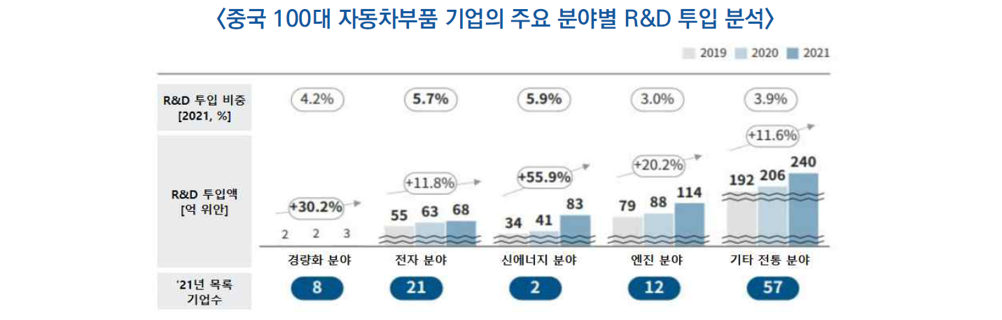 ○ ′21년 중국 100대 자동차부품 기업의 전체 R&D 투입은 508억 위안으로 매출액의 4%를 차지하였으며, ′19~′21년간 연복합성장률은 18.5%를 기록