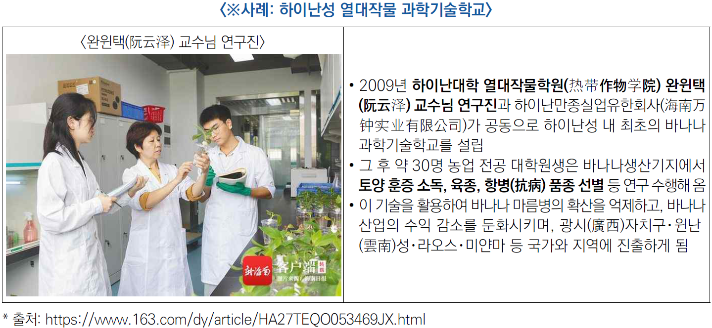 □ 최근 중국 교육부, 농업농촌부, 중국과학기술협회 등 3개 부처는 68개 대학원생 양성기관의 780개 과학기술학교(科技小院) 구축 지원정책을 마련(8.23)