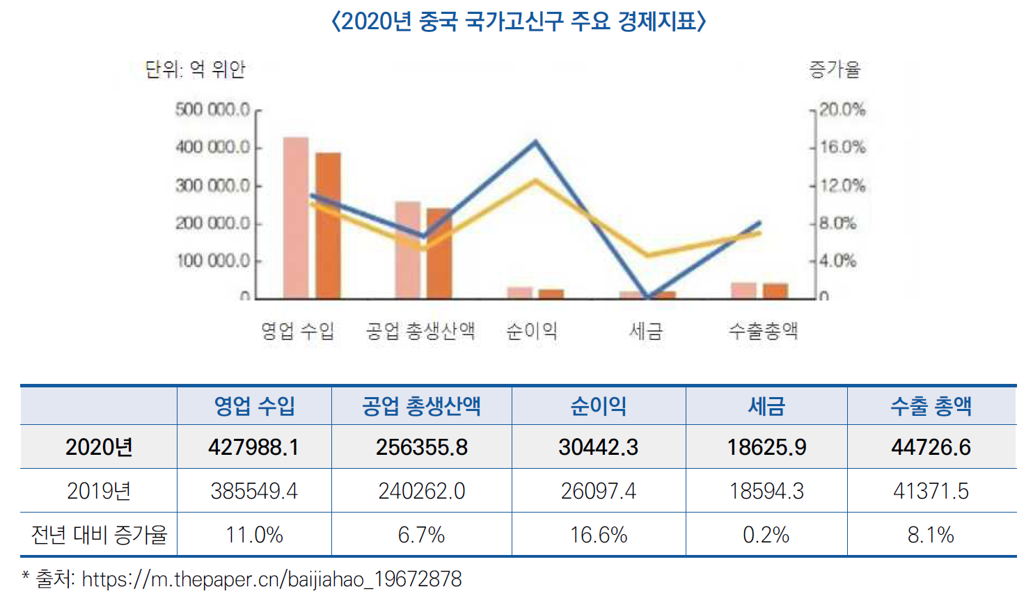 - 국가고신구 입주기업은 16.5만 개에 달하며, 영업 수입, 공업 총생산액, 순이익, 수출총액이 각각 427,998.1억 위안, 256,355.8억 위안, 30, 442.3억 위안, 44726.6억 위안으로 전년 대비 각각 11.0%、6.7%、16.6%와 8.1% 상승