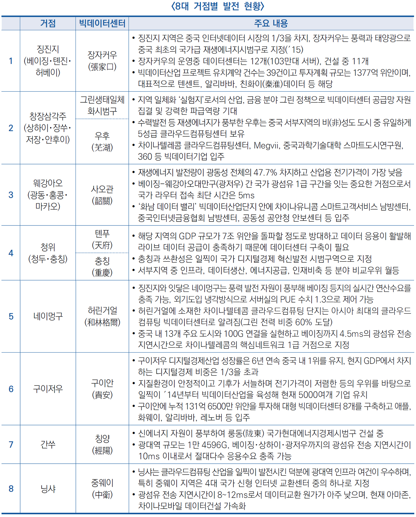 | ‘동수서산(東數西算)공정’ 8대 데이터 거점 발전 현황 | ||