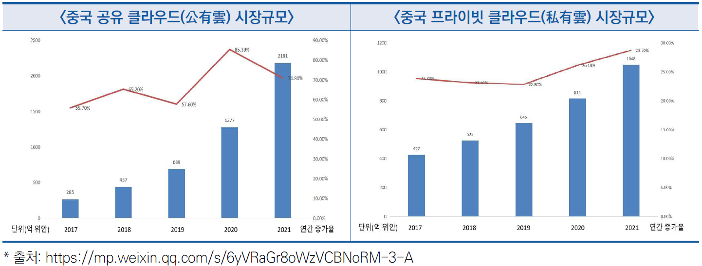 - 프라이빗 클라우드(私有雲) 시장규모도 1,048억 위안(20조 원)으로 전년 대비 28.7% 성장