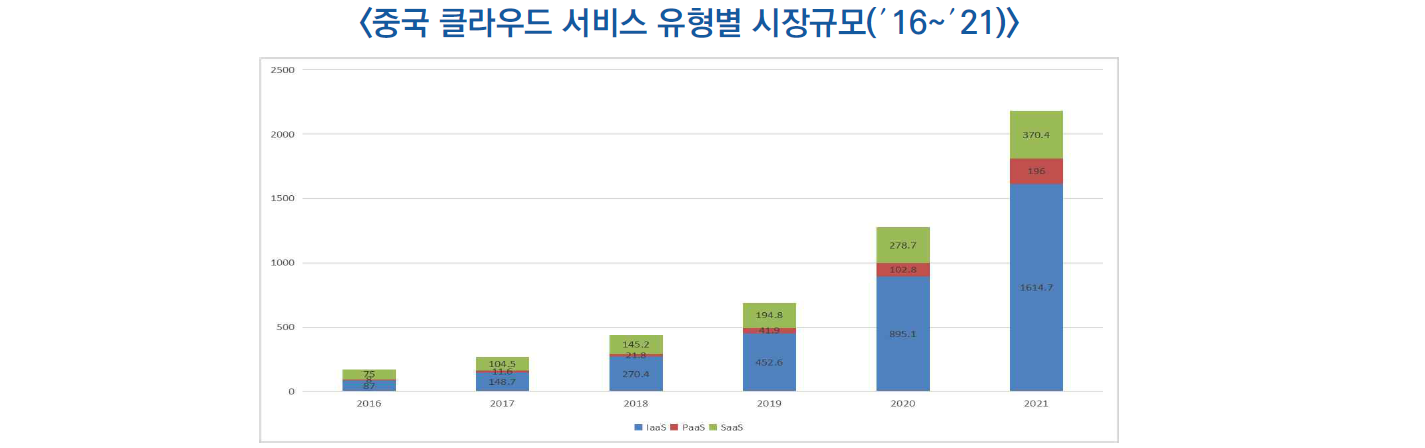 ![]() ○ 중국 클라우드 서비스 유형별로 보면 ′21년 IaaS와 PaaS는 급속도로 증가하고 있으며 SaaS는 안정적으로 성장 중