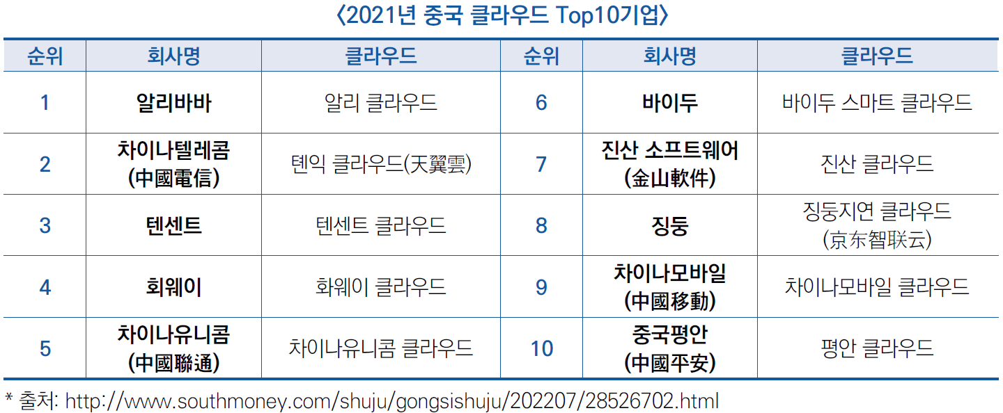 ![]() ○ 중국 클라우드 대표적 기업으로 알리 클라우드(阿裏雲), 톈익 클라우드(天翼雲), 텐센트 클라우드(騰訊雲), 화웨이 클라우드(華爲雲), 차이나유니콤 클라우드(联通雲)를 들 수 있음