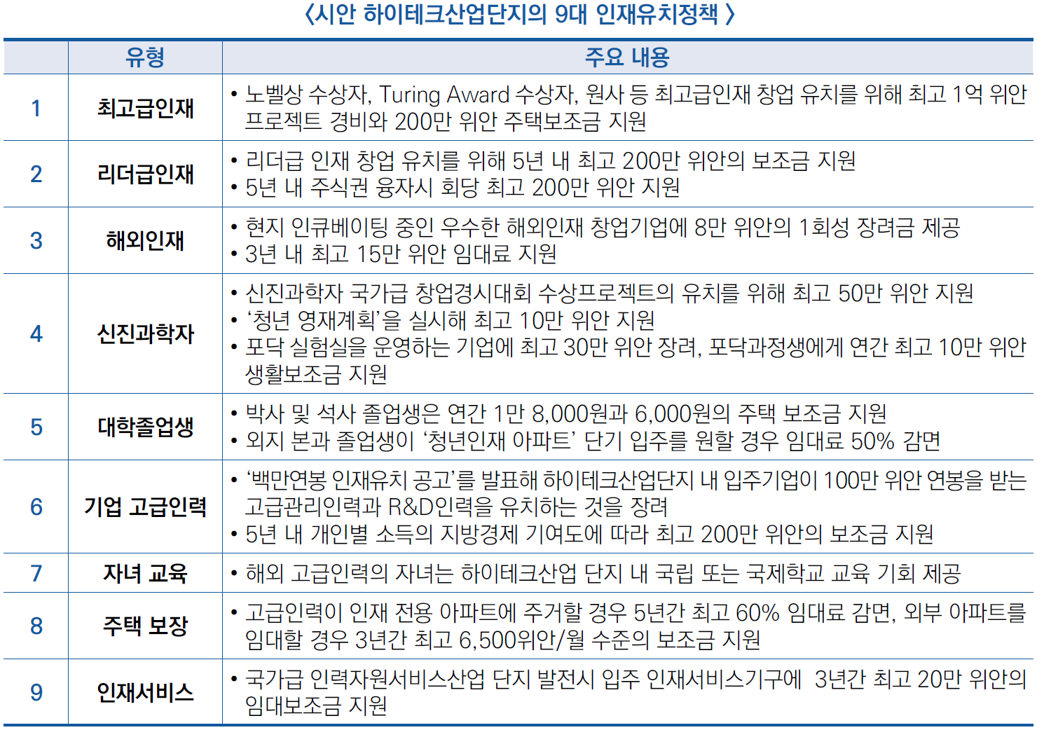 □ 시안 하이테크산업단지는 ‘백만인재계획’ 뉴딜정책을 발표해 향후 3년 내 광전자, 스마트제조 및 신에너지소재 등 기간산업 발전에 필요한 첨단기술 혁신형 고급인재 1만 2,000명을 유치(6.8)