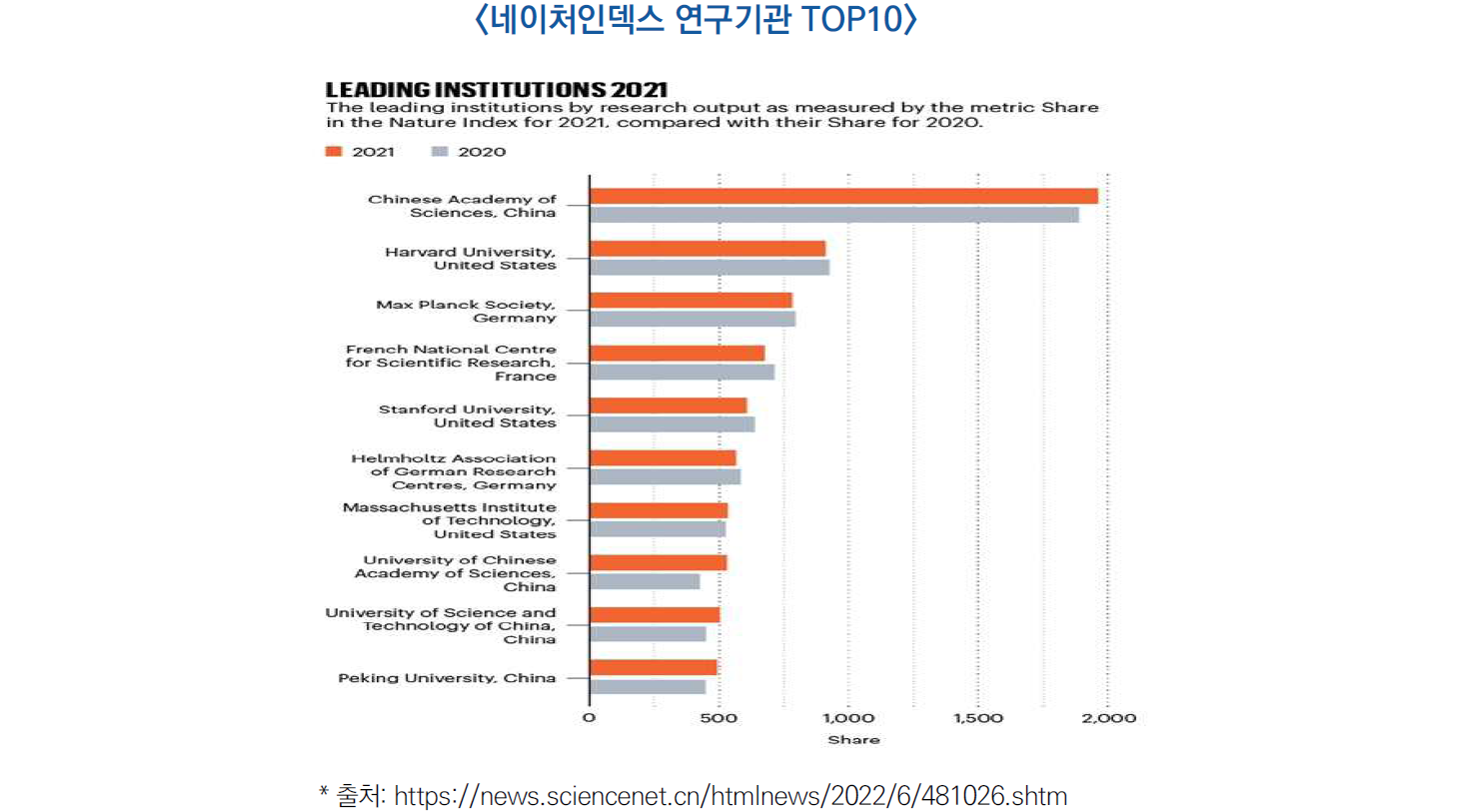 ○ ′21년 네이처인텍스* 기준, 전 세계 자연과학분야 국가연구기관 중 중국과학원이 연속 10년 1위를 차지하였고, 하버드대학, 막스플랑크연구소가 각각 2~3위에 해당