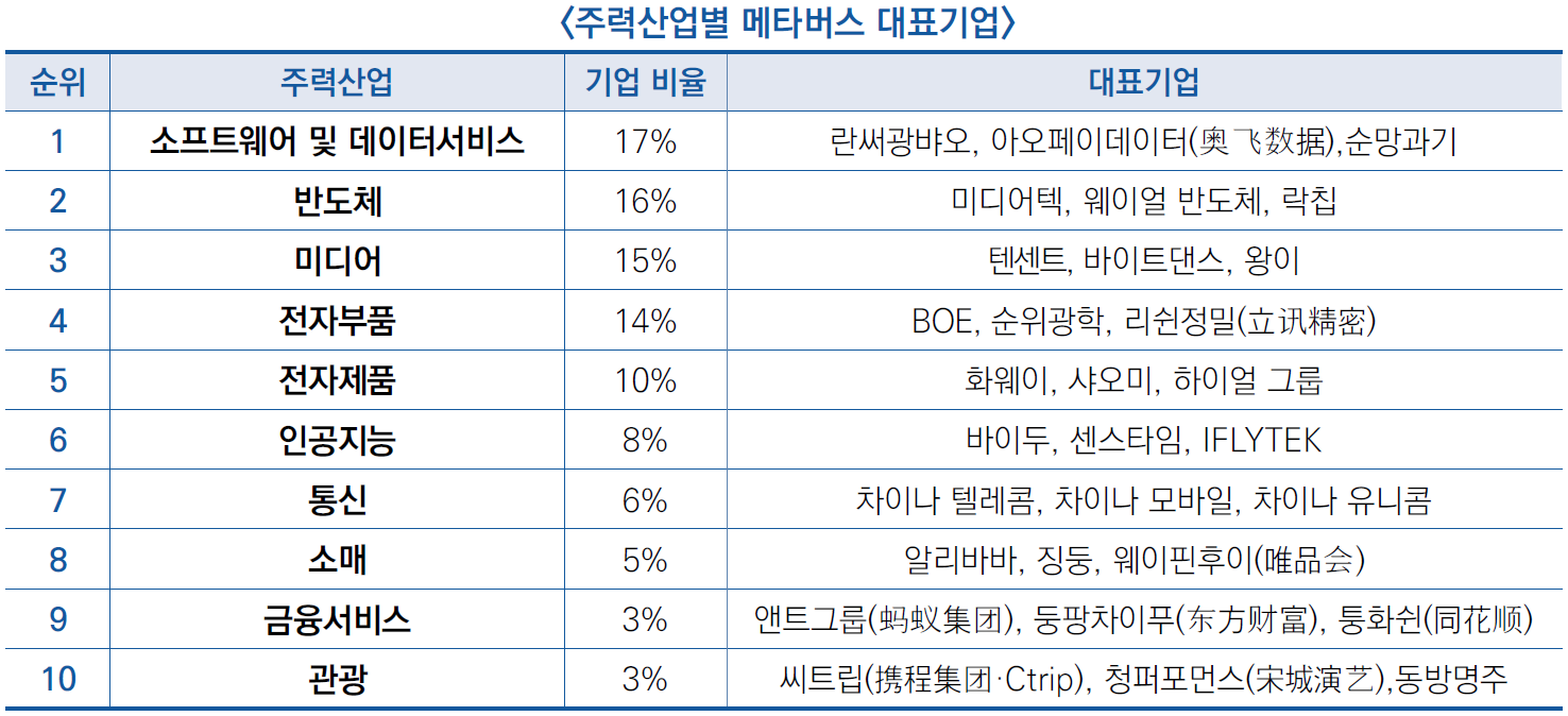![]() - 소프트웨어 및 데이터서비스를 주력산업으로 하는 기업은 17%로 1위를 유지하고 반도체, 미디어, 전자부품, 전자제품, 인공지능, 통신, 소매, 금융서비스, 관광 기업은 각각 2~10위를 차지
