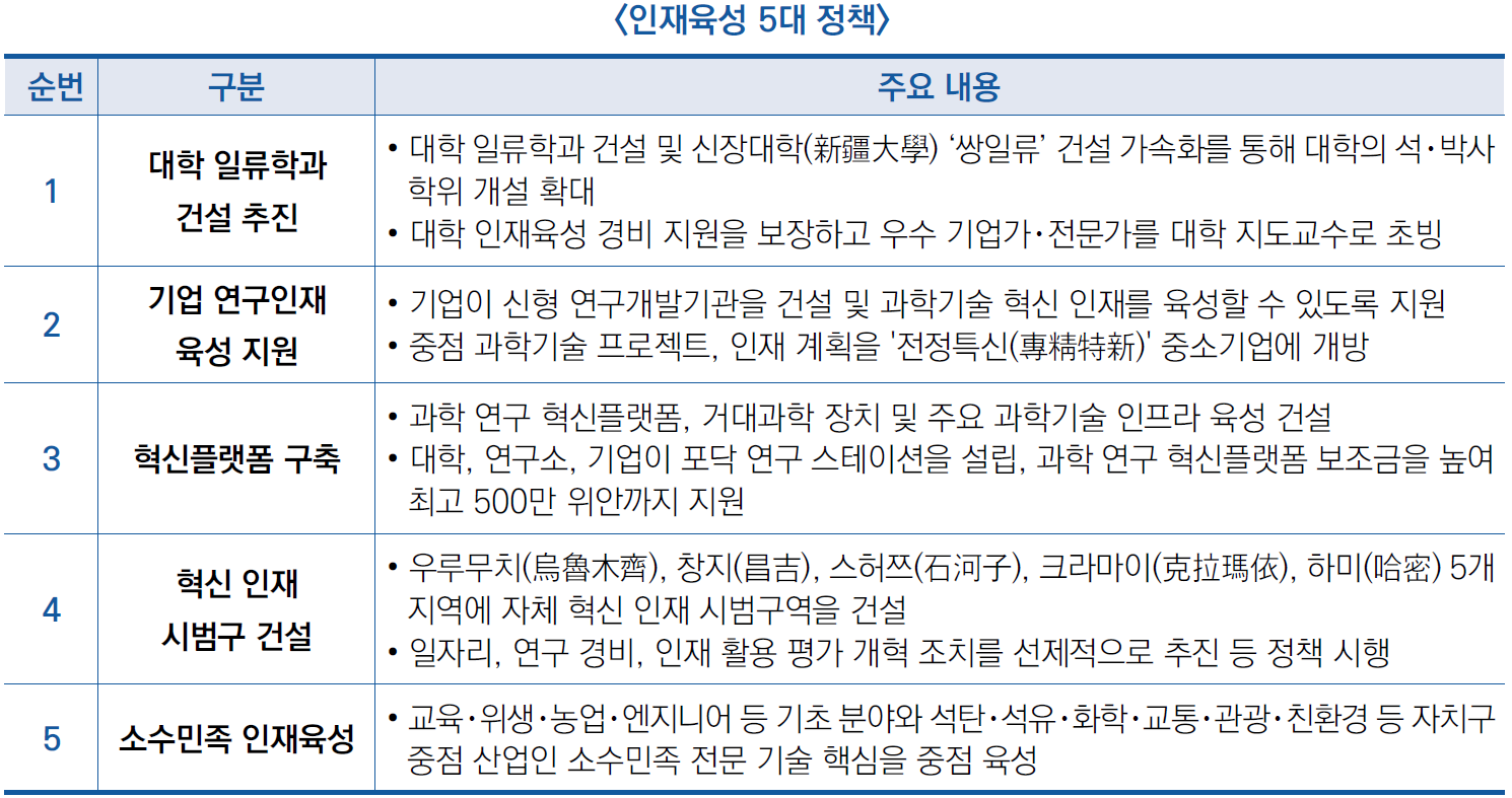 - '과학기술 혁신선도 인재' , '과학기술 혁신팀' , '청년 최우수 인재', '기초연구 인재' , '철학··사회·과학 인재 및 신장 문화 장인' 등 5개 인재양성 전문프로그램을 설립하여 연간 최고 200만 위안의 경비 지원