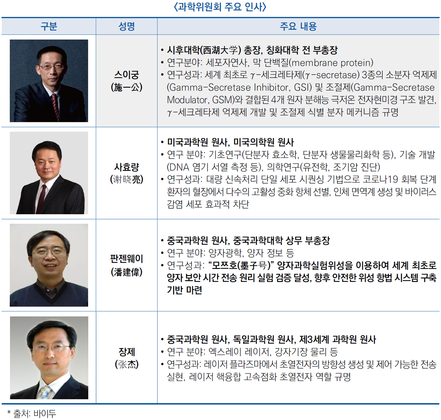 - 스이궁(施一公) 칭화대학 전 부총장을 과학위원회 초대 위원장으로 임명