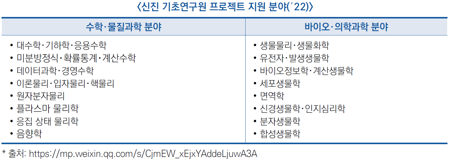 - 향후 10년간 100억 위안(1조 9,493억 원)을 투입하여 ‘수학・물질과학’ 및 ‘바이오・의학과학’ 2대 기초연구 분야 연구자를 지원할 계획