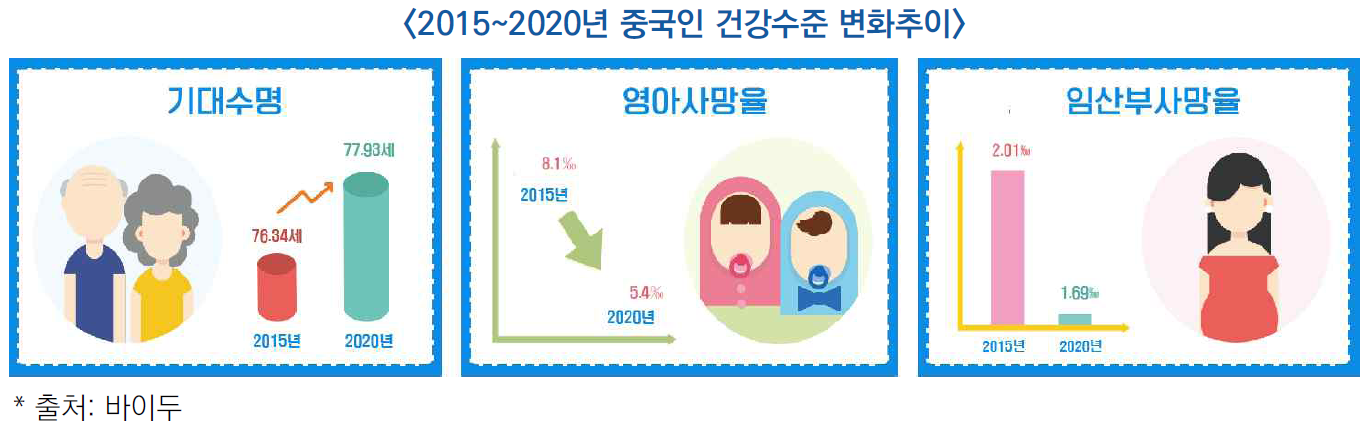 - ′15~′20년 중국인의 기대수명은 76.34세에서 77.93세로, 영아사망률은 8.1‰에서 5.4‰로, 임산부사망률은 2.01‱에서 1.69‱로 각각 감소