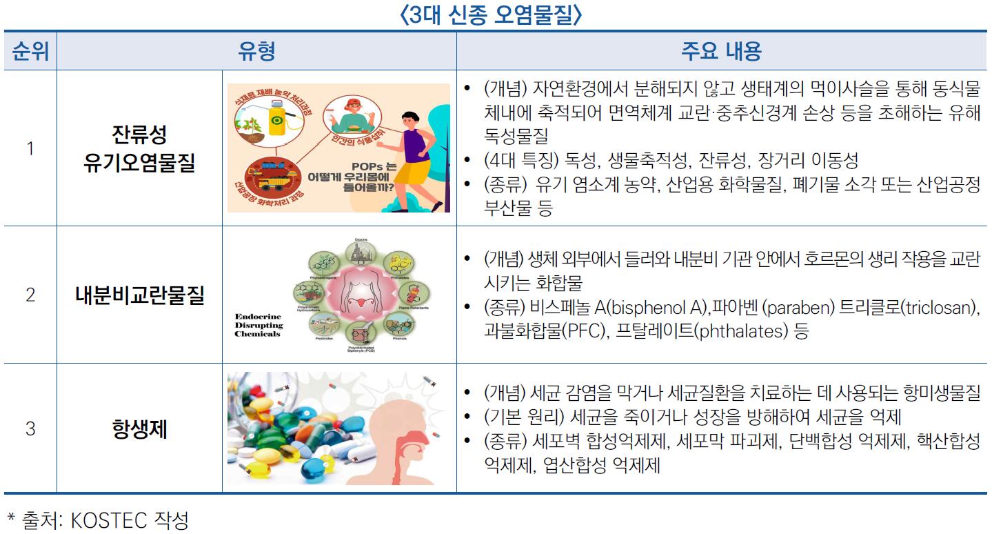 ※ 신종 오염물질은 국제협약의 관리·통제를 받는 잔류성 유기오염물질(POPs)·내분비교란물질(EDC)·항생제 등 크게 3가지로 나눔