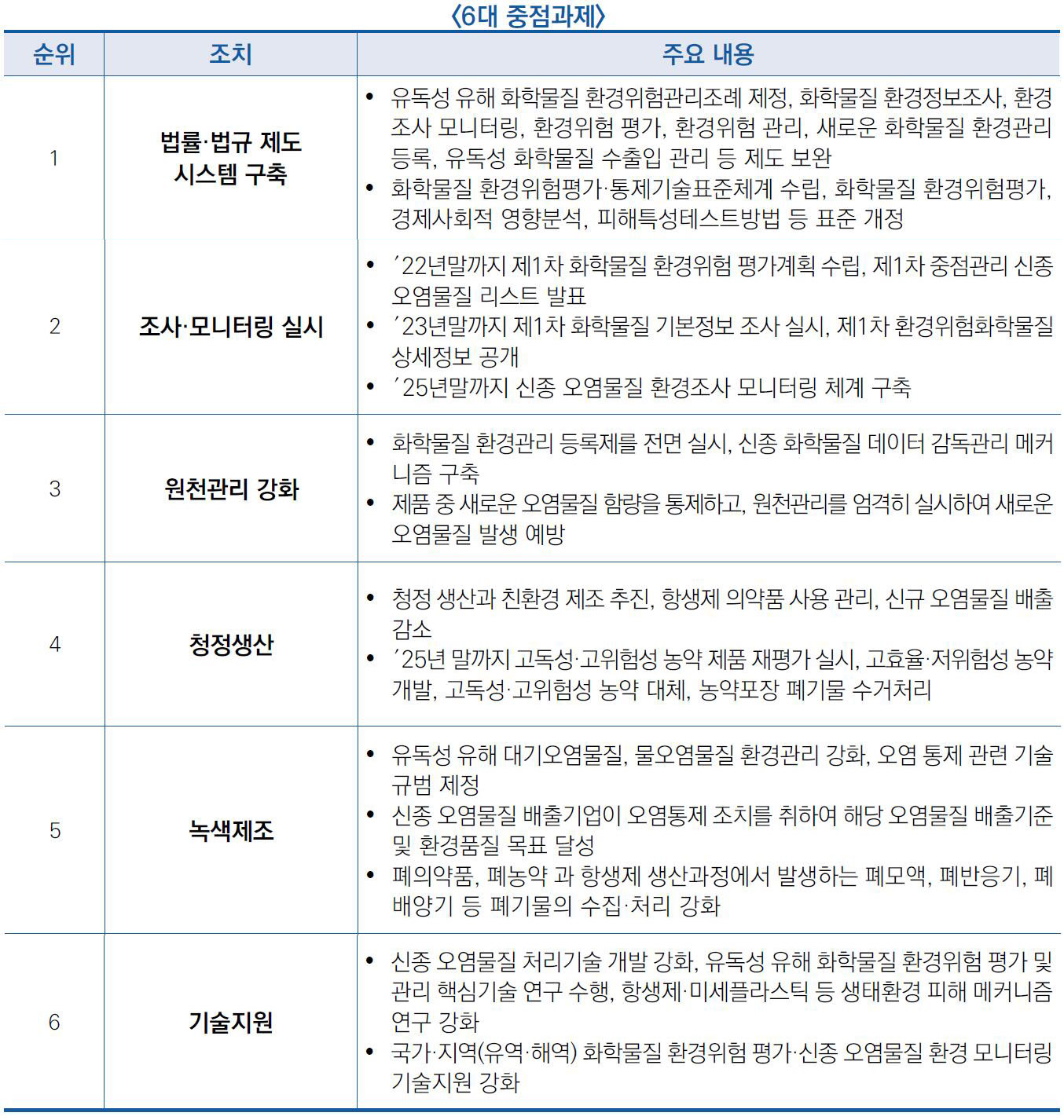 ![]() - ′25년까지 중점 화학물질에 대한 위험성 평가 완료, 관리 중인 새로운 오염물질 목록 공개, 금지조치 및 배출상한 설정 등 통제 조치 시행