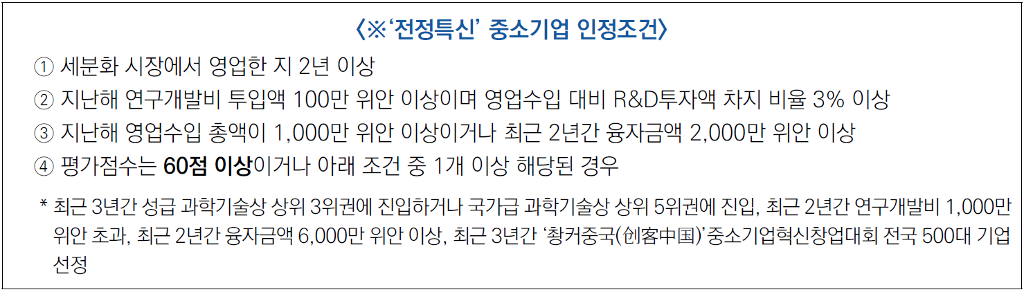 - 다음 4대 조건 모두를 충족한 기업을 ‘전정특신’ 중소기업으로 인정