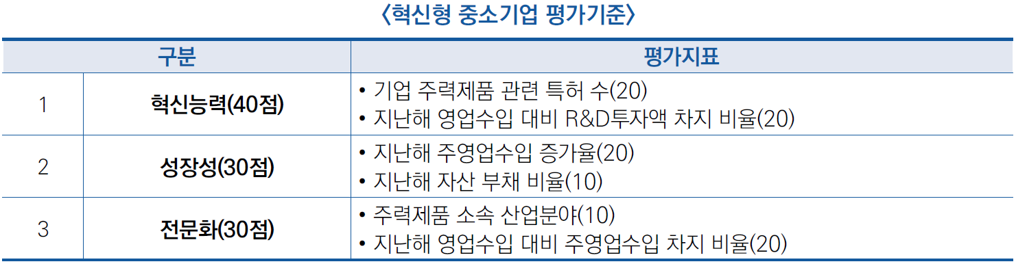 - 평가점수가 60점 이상이거나 아래 조건 중 1개 이상 해당하는 기업을 혁신형 중소기업으로 인정