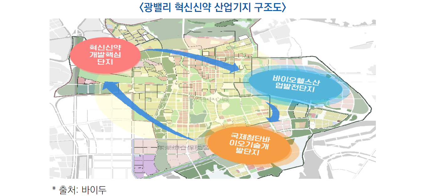 - (혁신신약개발핵심단지) 바이오의약혁신단지와 의학건강단지로 구성되어 ‘정부·의약업체·연구기관·투자기관·기업(政醫研資企)’ 협동혁신 및 과기성과이전시스템 구축