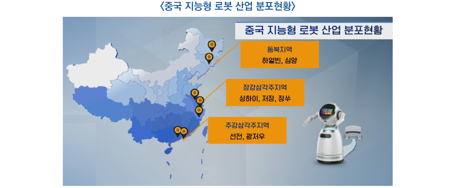 ○ 중국 내 지능형 로봇 산업은 주로 둥북지역, 장강삼각주, 주강삼각주 등 3대 지역에 집중