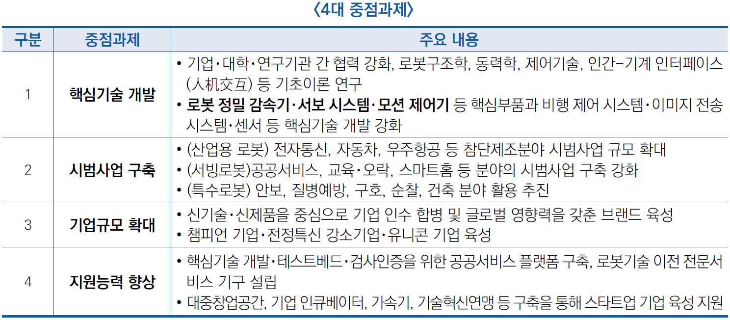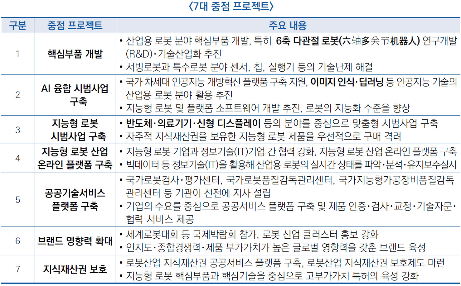 ○ 주요 내용으로 핵심부품 개발, 인공지능 융합 시범사업 구축, 지능형 로봇 시범사업 구축, 지능형 로봇 산업 온라인 플랫폼 구축 등 7대 중점 프로젝트를 제시