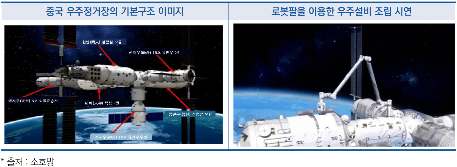 - 우주정거장 단계(′20년 전후) : 톈허(天和) 핵심모듈과 원톈(問天)·몽톈(夢天) 실험실 모듈 등을 발사해 장기체류가 가능한 우주정거장 독자 건설