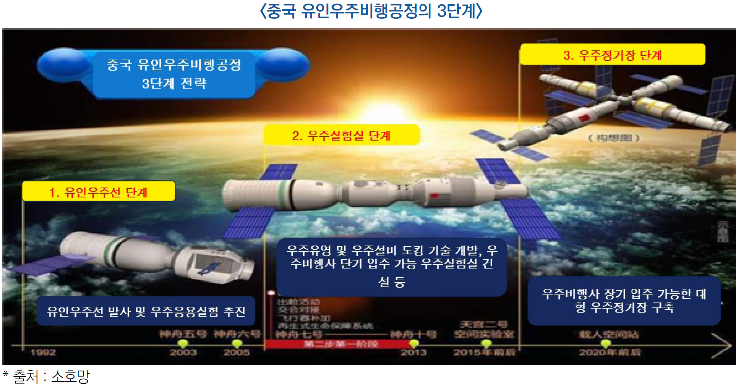 ○ 중국은 ′92년부터 ‘중국 유인우주비행공정’을 가동하여 유인우주선, 우주실험실 및 우주정거장 3단계로 구분하여 지속적으로 추진 중