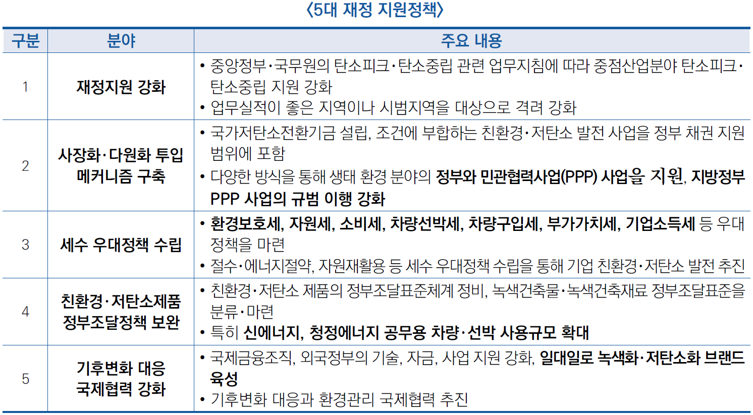 - 2030년까지 친환경·저탄소 발전 지원 재정·세무 정책 체계 기반을 마련하고, 장기적 친환경·저탄소 발전 촉진 메커니즘 구축