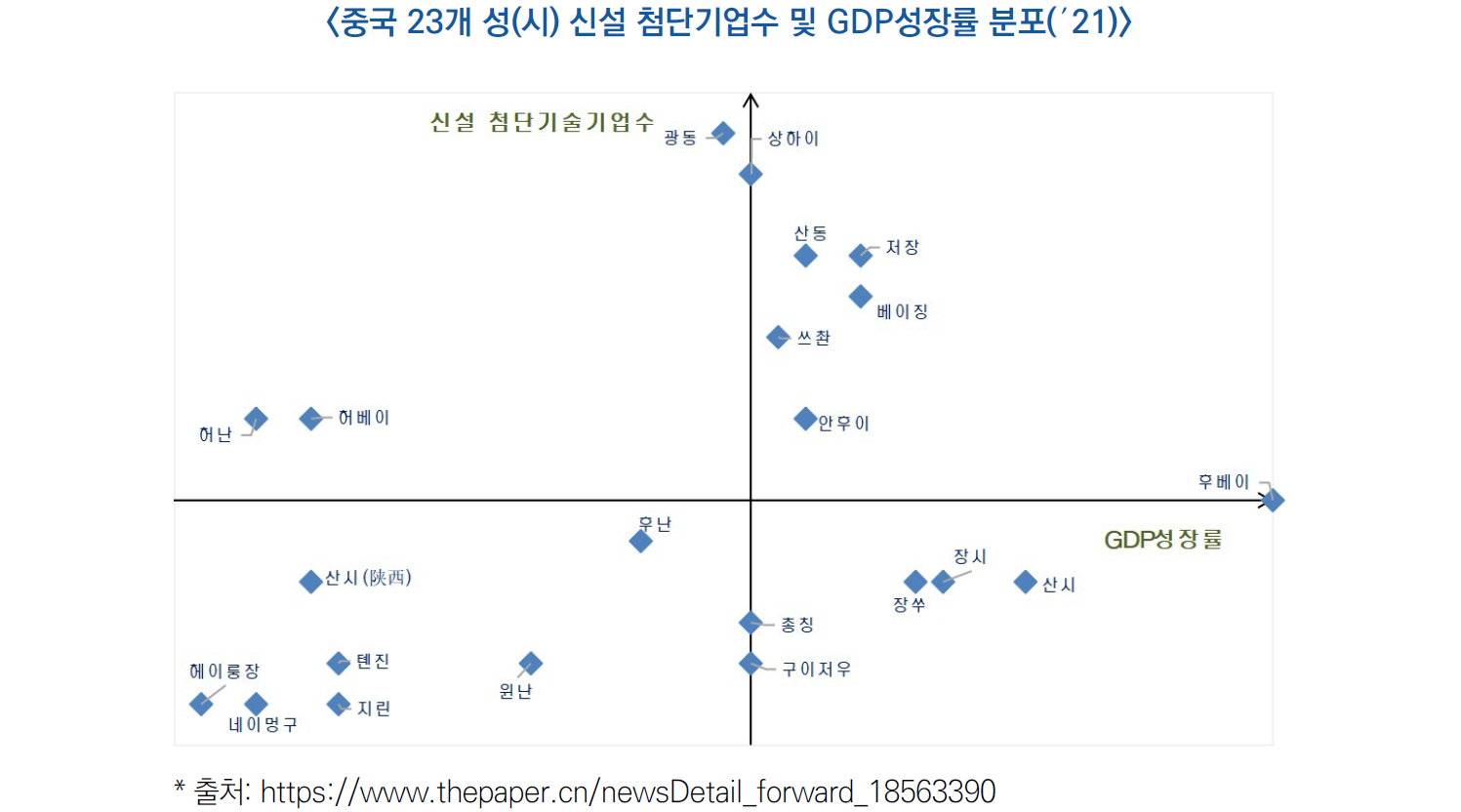 ![]() ○ ′21년 기준 23개 성(시)를 대상으로 GDP성장률과 신설 첨단기술기업 수를 분석한 결과 산둥·저장·쓰촨·안후이 등 도시는 중국 내 선두그룹에 위치