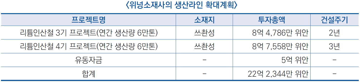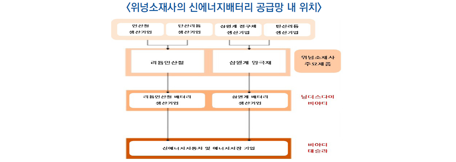 - 최근 위넝소재는 중국 내 리튬배터리산업 시장의 70%를 확보한 닝더스다이와 비야디의 직접 투자를 받으면서 안정적인 납품대상 기업 확보(닝더스다이는 위넝소재의 10.54% 주식 확보)