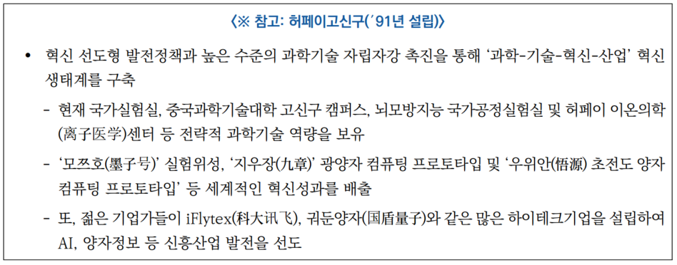 - 중국과학원 양자정보・양자기술혁신연구원, AI연구원, 허페이첨단컴퓨팅센터 등 신인프라 및 연구기관을 중심으로 양자정보, AI, 의료건강 분야 성과 창출