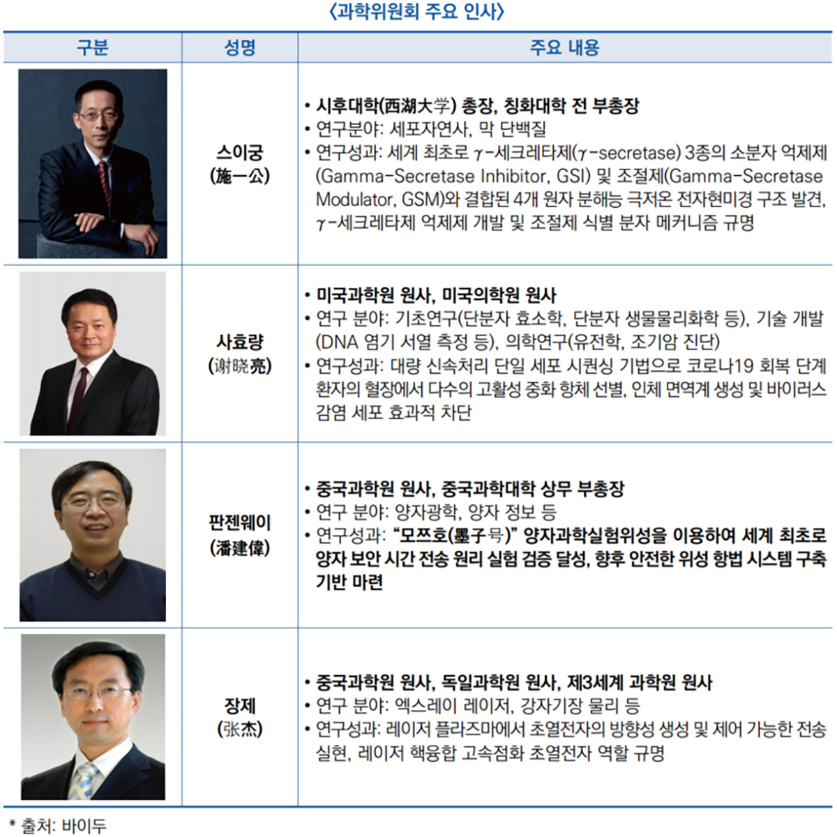 - 이외 중국 내 최고 과학자로 구성된 과학위원회를 설립하여 스이궁(施一公) 칭화대학 전 부총장을 과학위원회 초대 위원장으로 임명