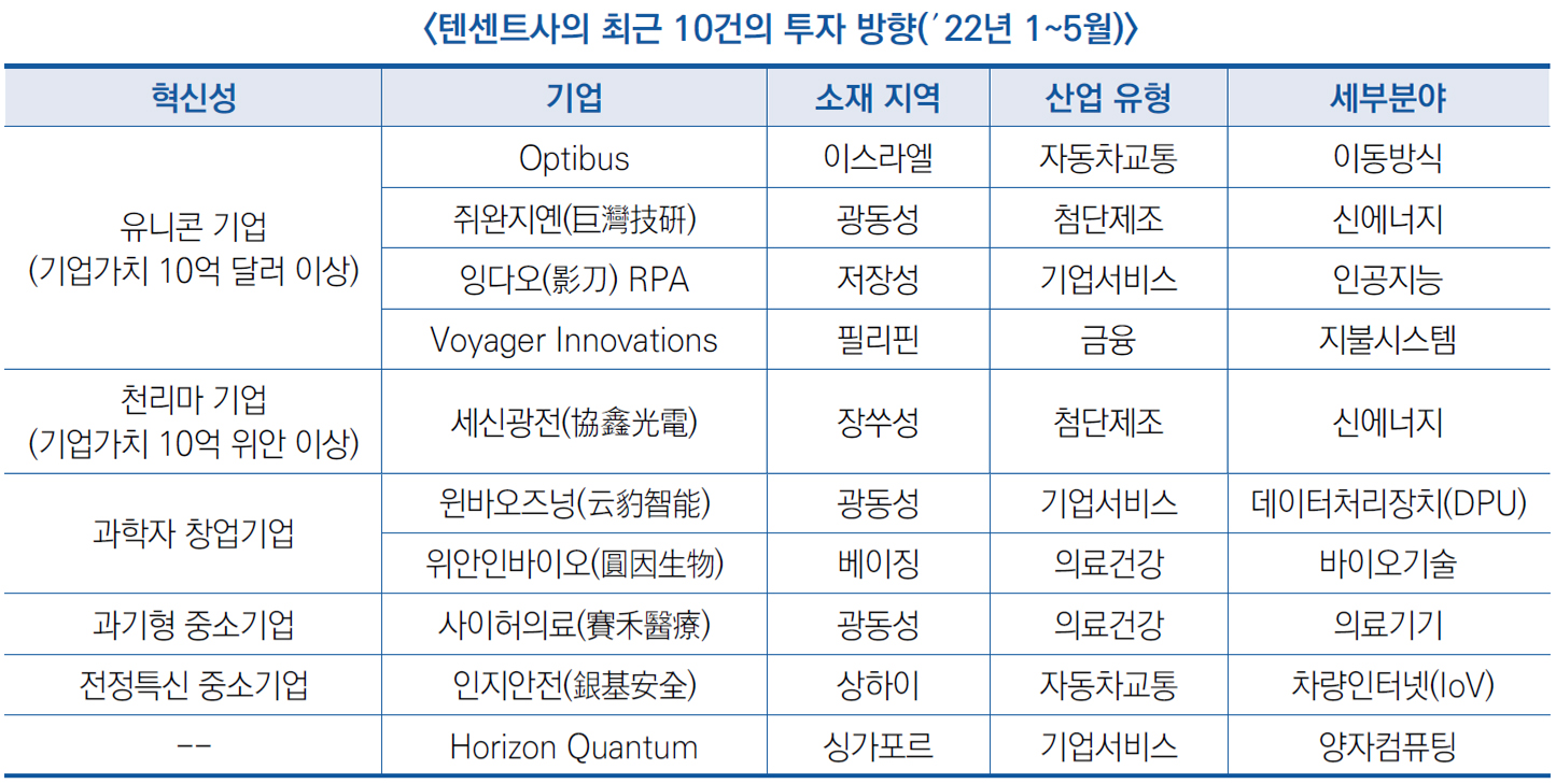 □ 텐센트는 최근 반도체, 인공지능, 바이오기술 등 첨단기술 방향의 투자를 확대하고 있는 추세(5.23)