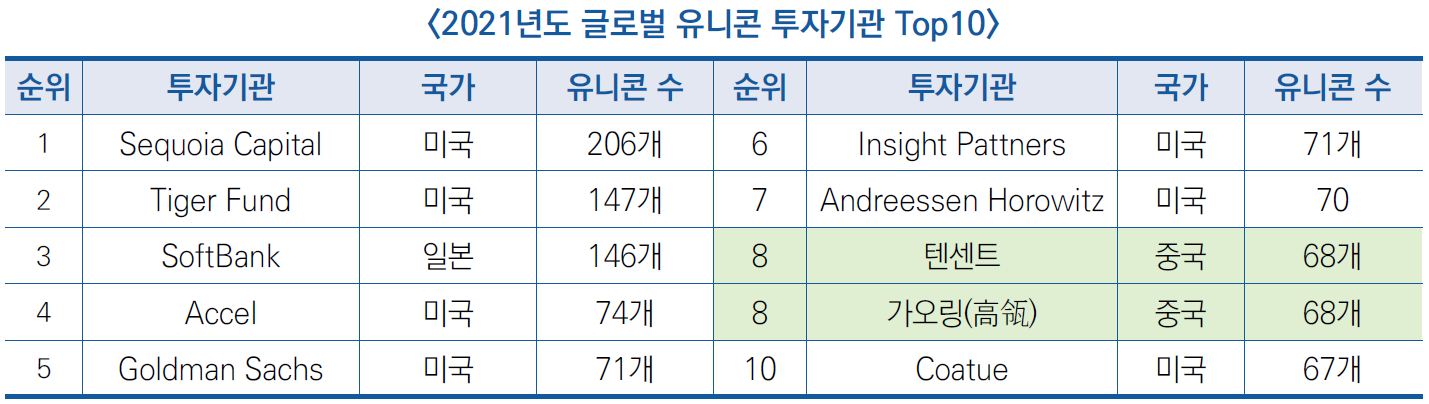 * 알리바바, 바이두 등 인터넷기업과 가오링(高瓴), 종진(中金) 등 벤처투자기관도 해외 유니콘 투자 확대 추세