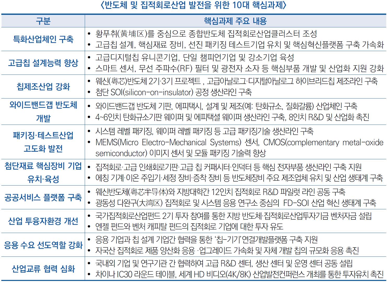 - 특히 고급칩설계 능력을 향상하기 위해 유니콘기업, 단일 챔피언기업 및 강소기업을 육성하여 스마트 센서, 무선 주파수(RF) 필터 및 광전자 소자 등 핵심부품 개발 및 산업화 지원 강화