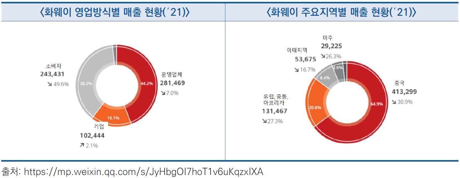 ○ ′21년 화웨이 매출액은 5,368억 위안(102조 6,415억 원)으로 전년 대비 28.6% 감소했으나 순이익은1,137억 위안(21조 7,405억 원)으로 75.9% 증가