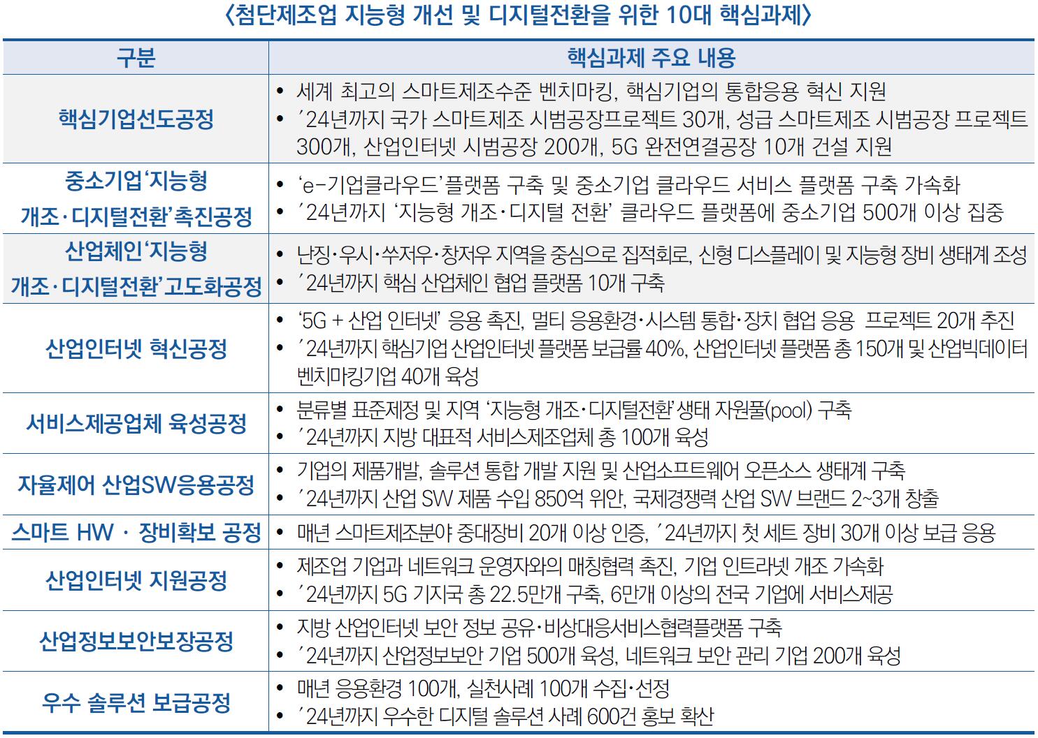 ○ ′24년까지 장쑤성 제조업 디지털화・네트워크화・지능화 수준 대폭 향상 및 국가 제조업 고품질 발전 시범구 도약을 목표로 10대 핵심과제를 제시
