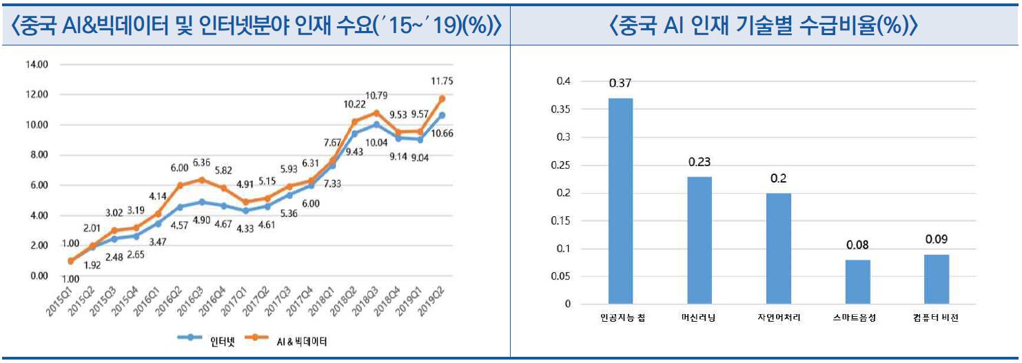 - 알고리즘 연구, 응용개발, 실용기술, 첨단기술 등 기술인력은 매우 부족하고 특히 △인공지능 칩 △머신러닝(機器學習) △자연어처리 △스마트음성 △컴퓨터 비전 등 인력 수요 급증