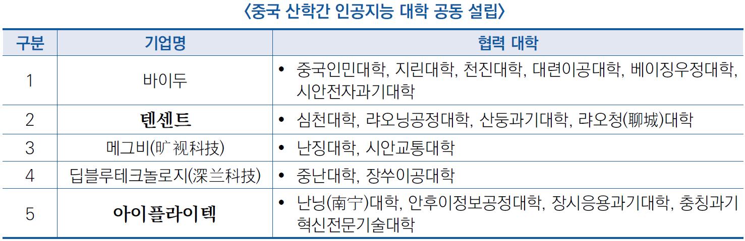 - 중국 내 AI인재가 주로 바이두, 알리바바, 텐센트, 아이플라이텍 (iFLYTEK, 科大讯飞) 등 대기업, 인공지능 분야 스타트업 기업과 유니콘기업에 집중
