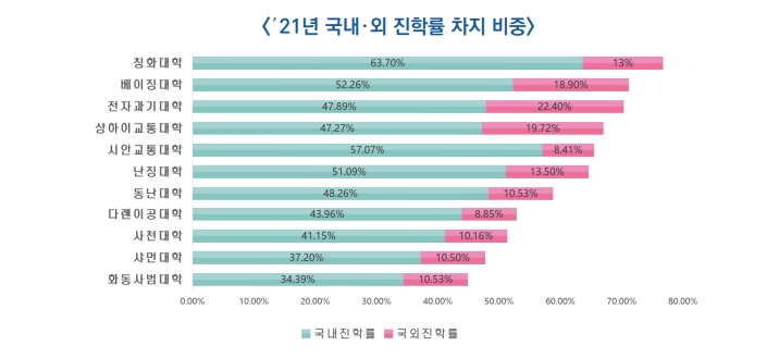 – 칭화대학 베이지징 취업률은 박사 55.9%, 석사 38.4%, 학부는 16.1%에 불과, 이는 ′20년보다 5.8% 하락하였고, 반면 상하이는 칭화대학 학부 졸업생 22.6%를 유치