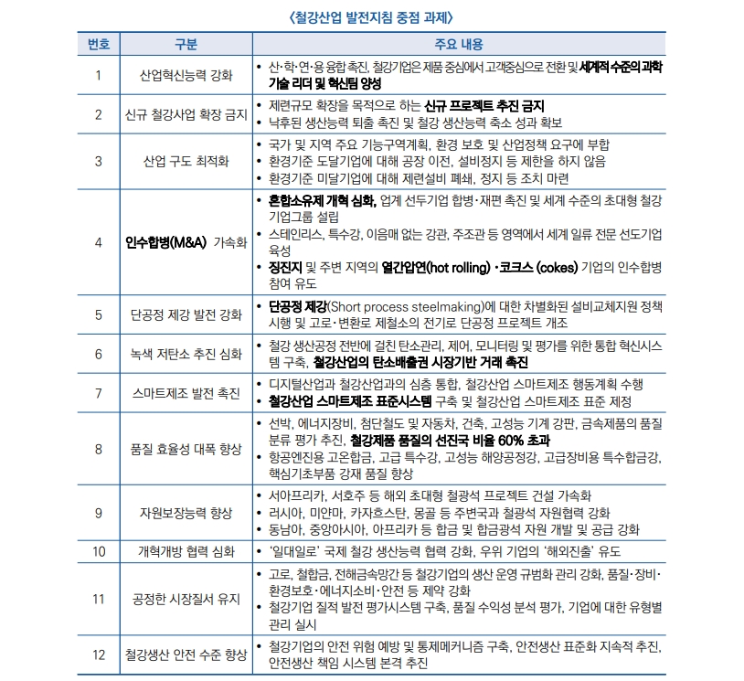 ● 중점과제로 산업혁신능력 강화, 신규 철강사업 확장 금지 및 산업 구도 최적화 등 12가지 제시
