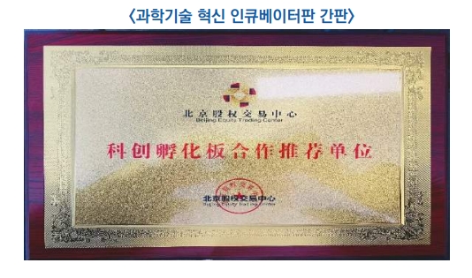 ▣ 이 외에 북경시과학기술위원회와 중관촌관리위원회, 베이징주식거래센터 등 3개 부서가 공동으로 중국 최초의 ‘과학기술 혁신 인큐베이터판(科創孵化板)’을 신설(12.17)