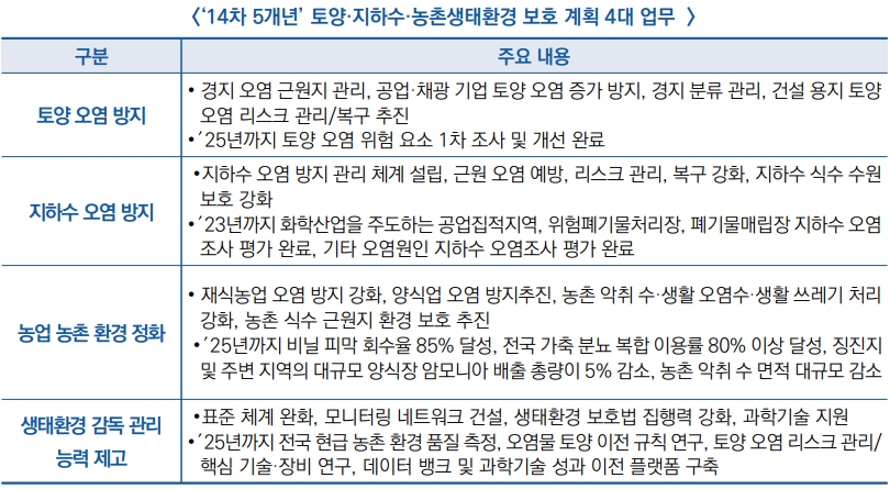 ● 향후 추진할 4대 공정으로 토양 및 지하수 오염 근원 보호 공정, 토양 및 지하수 오염 리스크 관리 및 복구 공정, 농업 오염 방지 공정, 농촌 환경 정화 등 선정