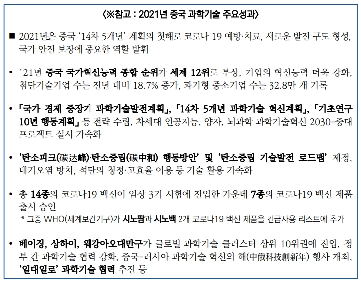 ▣ 최근 열린 2022년 전국 과학기술 업무회의에서 중국 과학기술부 왕즈강(王志剛) 부장은 ′22년 과학기술 10대 중점임무를 소개했음(1.6)