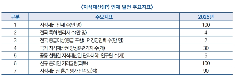 ● IP 인재양성을 위해 △IP 인재양성훈련기지 조성 △IP 온라인 교육과정 개설 △IP 인재거점 구축 △IP 싱크탱크 전문가 인재뱅크 구축 △IP 직무평가 △IP 전문학위 개설지원 등 6가지 프로젝트 추진 |