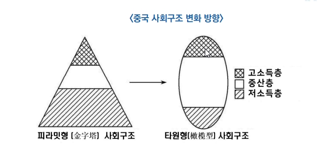 중국은 공동부유 목표 달성을 위하여 피라밋형(⾦字塔型)의 사회구조에서 타원형(橄榄型)의 사회구조로 전환하여 소득분배의 불균형을 개선할 예정임