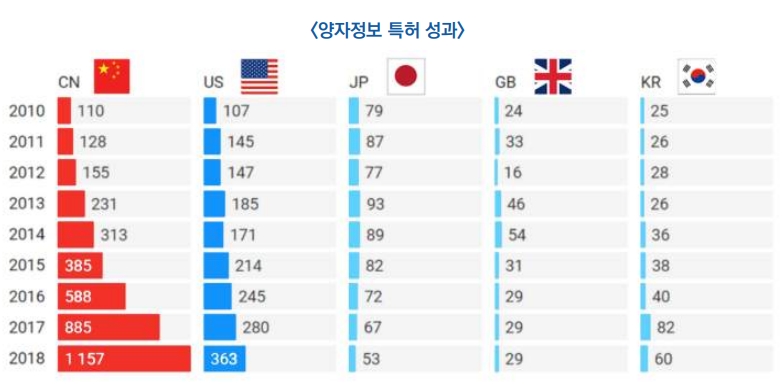 3) 양자 정보 중국은 양자 컴퓨팅, 양자통신 및 양자센싱을 포함한 양자 정보 과학의 특정 영역에서 미국을 추월 – 현재 중국의 양자 정보 분야 R&D 투자는 미국의 4배 수준이며, 중국과학기술대학은 구글의 양자컴퓨터 Sikmo보다 100억 배 이상 빠른 광양자 컴퓨터 계산기술을 개발