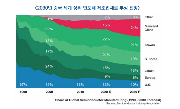 4) 반도체 향후 10년동안 중국이 전세계 생산량의 40%를 개발하여 24%의 시장 점유율을 가진 세계 최대 반도체 제조업체가 될것으로 전망(반도체 산업협회) – 중국의 반도체 생산량은 1990년 1% 미만에서 15%로 증가하였으나, 미국의 점유율은 37%에서 12%로 하락