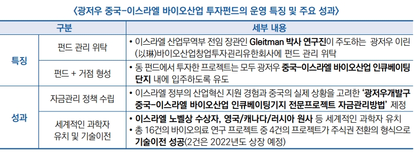 ▣ 광저우는 국가발전개혁위원회로부터 중국-이스라엘 첨단기술산업협력 중점지역(’13)으로 선정된 이후 ‘광저우 중국-이스라엘 바이오산업 투자펀드’를 효과적으로 운영해옴(’12.14)