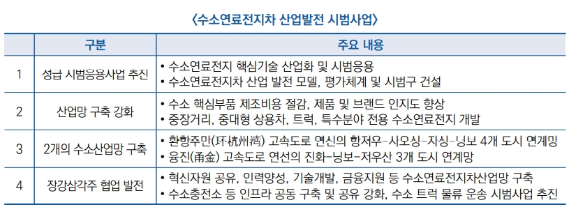 ● 수소연료전지차 산업발전과 관련 4개의 시범사업을 추진해 1조 위안(186조 원) 규모의 자동차 산업 클러스터 구축 및 수소에너지 산업생태계 조성