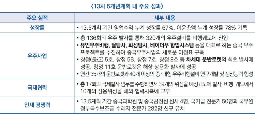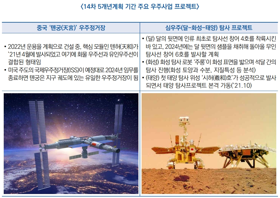 ● (계획) 이번 14차 5개년계획에서는 운반로켓과 우주설비를 포함한 기술혁신능력, 산업발전능력, 경영관리능력을 향상시켜 국제영향력과 산업영향력을 확대함으로써 세계 일류의 우주기업으로 부상한다는 발전목표를 수립함