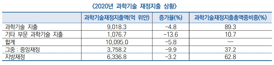 ● (국가재정의 과학기술 지출) 지난해 코로나19 영향으로 국가재정의 과학기술 지출액은 10,095.0억 위안(5.8%↓) 이고 그중 중앙재정 및 지역 재정 과학기술 지출액은 각각 3,758.2억 위안(9.9%↓), 6,336.8억 위안(3.2%↓)으로 소폭 감소 추세